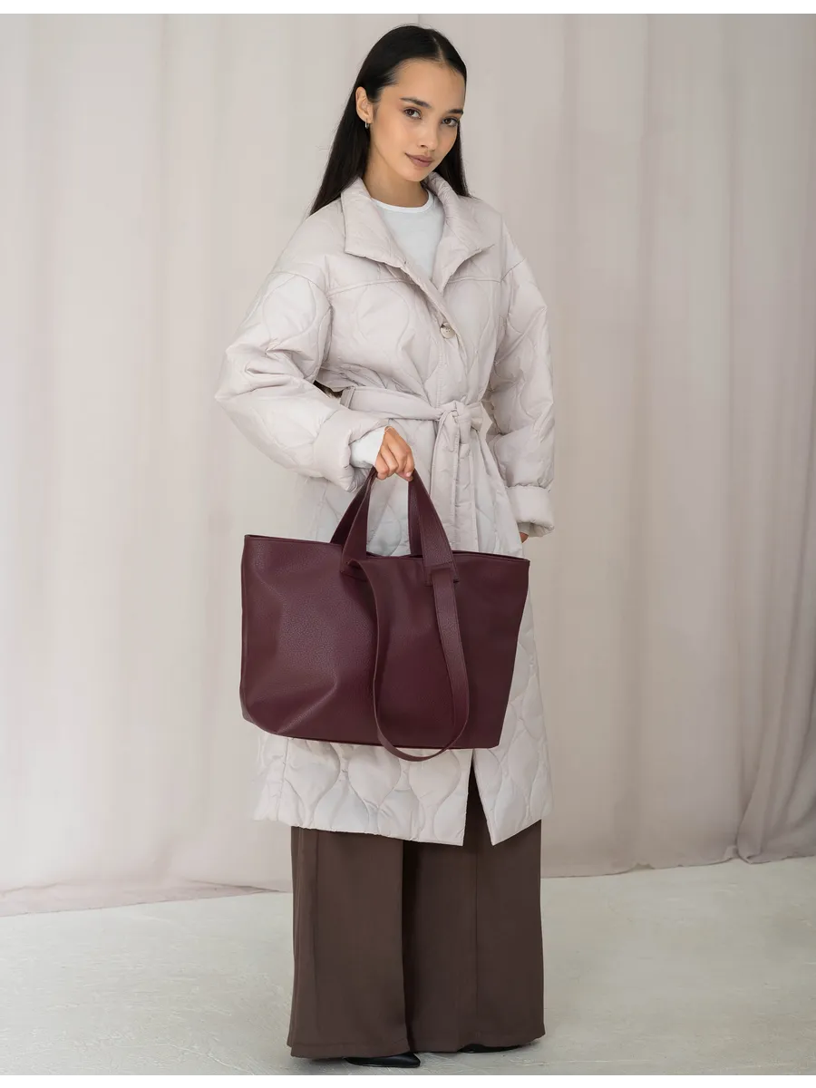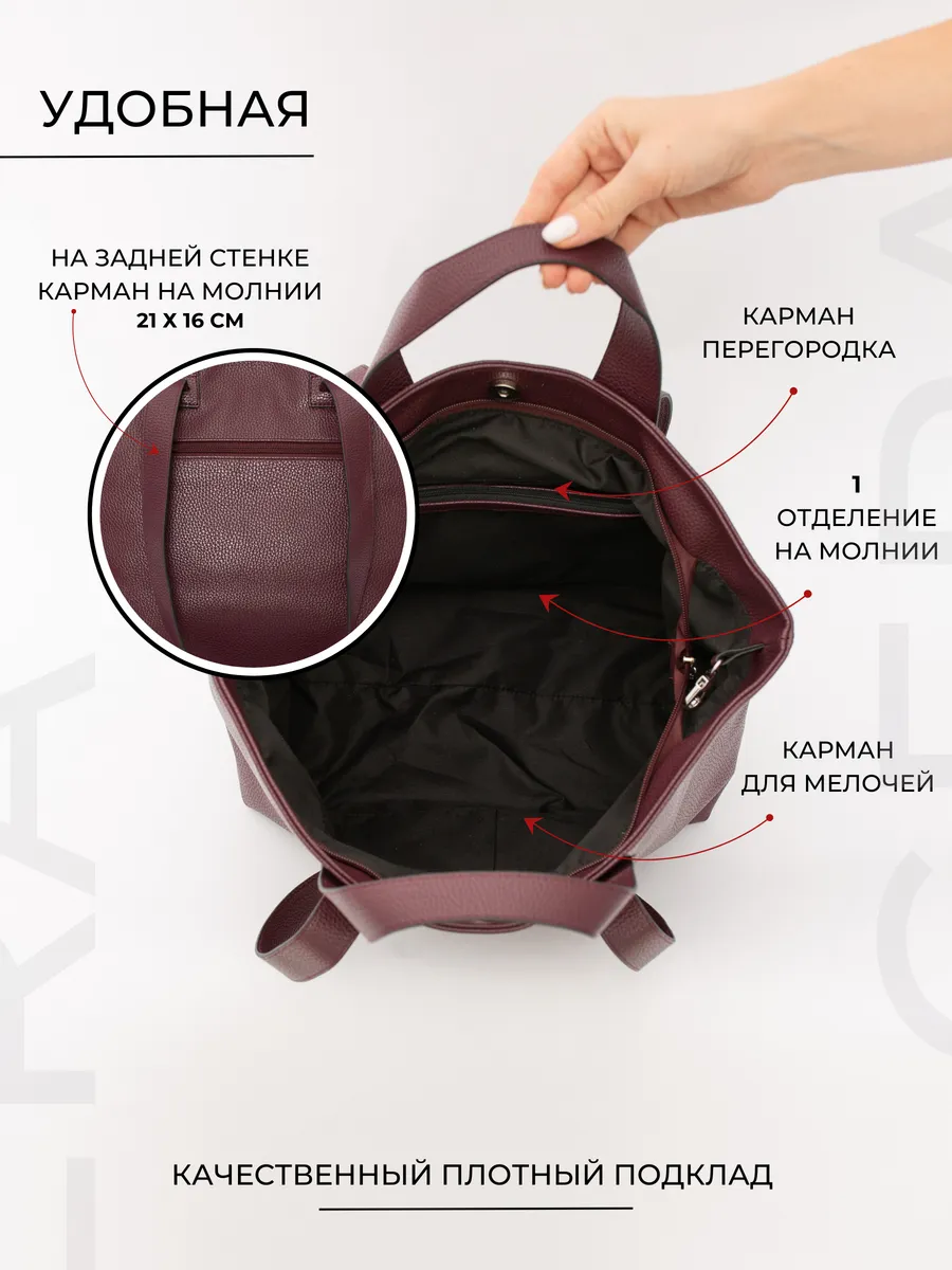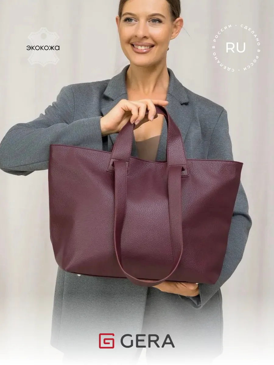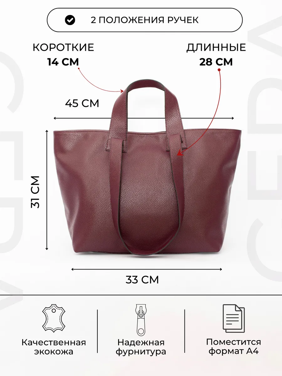Сумка женская большая и вместительная выполнена искусственной кожи отличного качества, которая сохраняет свои первозданные свойства в течение долгого времени, что обеспечивает не только эффектный внешний вид, но и высокую износостойкость и не уступает сумкам из натуральной кожи. Эта вещь станет незаменимым аксессуаром для девушек и женщин в любой ситуации - от повседневных дел до деловых встреч и путешествий. Швы прошиты прочной лавсановой нитью, крепкая подкладочная ткань. Большая сумка мешок позволяет удобно упаковать все необходимые вещи - от книг и тетрадей до тренировочной формы для фитнеса. Шоппер на молнии из экокожи для женщин подойдет на каждый день, на прогулку, учебу в колледж школу университет, в офис или на работу. Яркий спортивный дизайн делает эту брендовую модель сумки хобо идеальной для прогулок и учебы, а классический стиль будет уместен в офисе и на деловых встречах. Сумочка дамская также укомплектована отделениями для телефона и других мелочей, что позволяет легко и быстро найти нужный предмет. Шоппер женский можно использовать как авоську для покупок можно носить в руках или повесить на плечо. Вмещает формат А4 и ноутбук. Эта универсальная вещь тоут подходит как для подростков, так и для женщин, которые ценят стиль и комфорт. Если вы ищете качественную и удобную сумку для путешествий на самолете, то большая дорожная сумка идеальный выбор. Сумка через плечо шоппер очень лёгкая и имеет размеры ширина по низу 33, по верху 45, высота 31, глубина 14 см, ручки имеют два положения: короткое, высота 14 см и удлиненное высота 30 см, одно основное отделение на молнии, внешний карман на молнии. Внутри сумки плотная подкладка, карман на молнии для мобильного телефона и карман открытого типа. Прекрасный подарок для любимой мамы или девушки. Женские сумки от бренда Gera - это качество российского производителя по доступной цене!