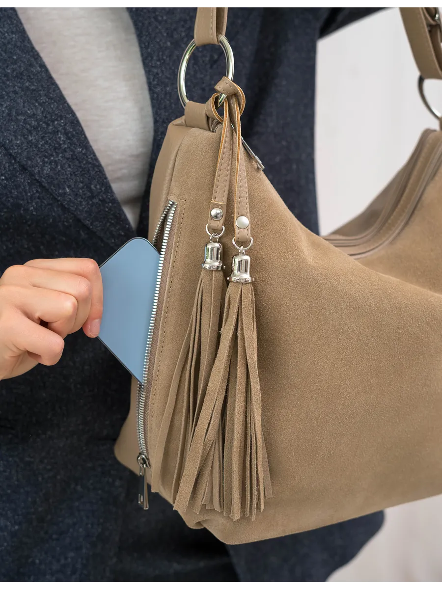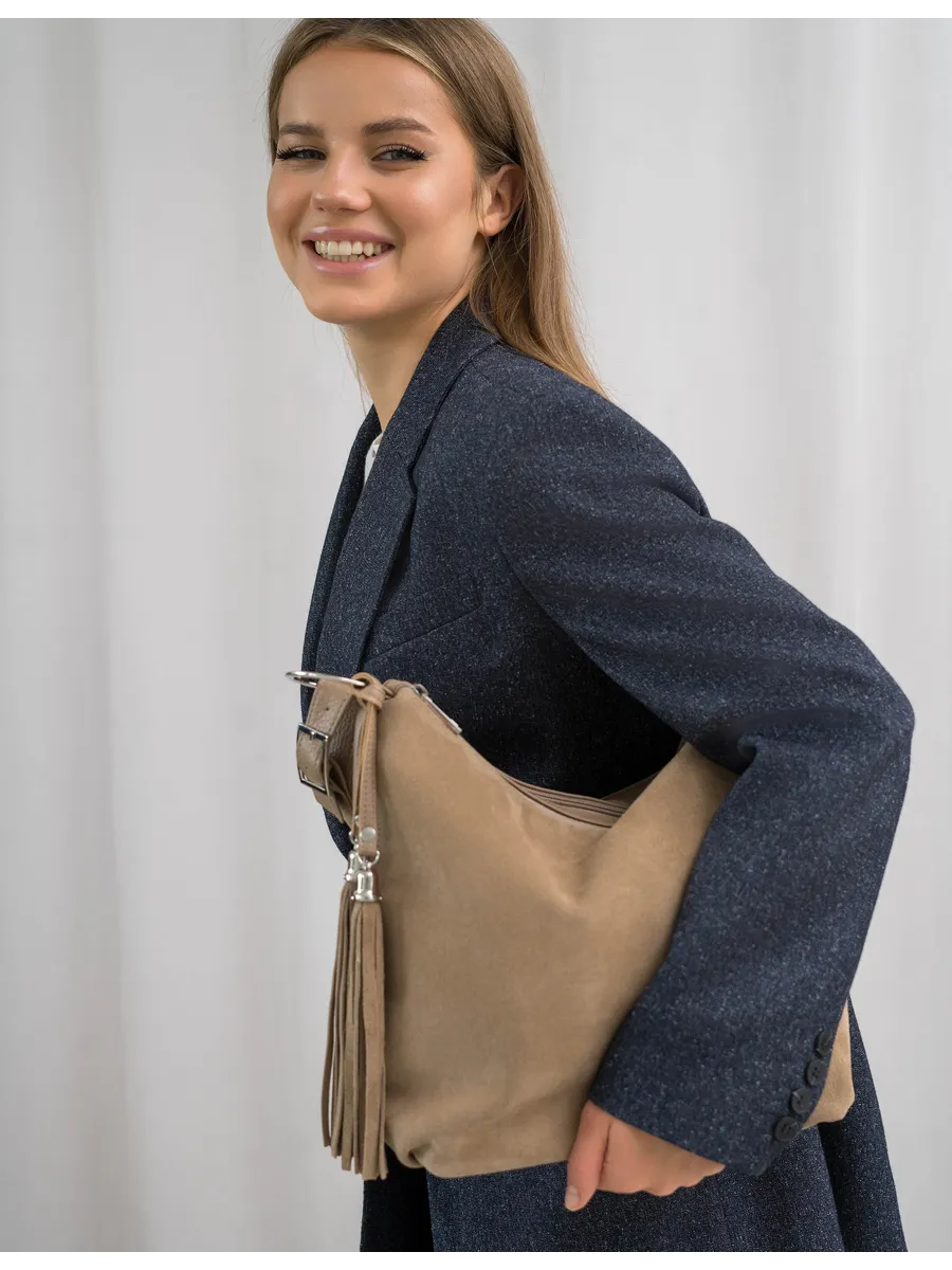 Представляем вам универсальную и стильную женскую сумку большую от бренда Gera Bags. Эта вещь станет незаменимым аксессуаром для девушек и женщин в любой ситуации - от повседневных дел до деловых встреч и путешествий. Модель выполнена из натуральной замши и из искусственной кожи премиум качества, что обеспечивает не только эффектный внешний вид, но и высокую износостойкость и не уступает сумкам из натуральной кожи. Швы прошиты прочной лавсановой нитью, крепкая подкладочная ткань. Шоппер очень лёгкая имеет размеры размеры 35*28*13 см, два основных отделения на молнии. Задний внешний карман 17*14 см, боковые наружные карманы 19*12см. Вместительный мешок позволяет удобно упаковать все необходимые вещи - от книг и тетрадей до тренировочной формы для фитнеса и спортивных занятий. Если вы ищете базовый тоут на любой сезон - это самый правильный выбор, она подходит на каждый день, на учебу в колледж школу университет, на работу, свидание, свадьбу или праздник. Сумка через плечо удобна в ношении благодаря мягким ручкам. Яркий дизайн делает эту модель идеальной для прогулок, а классический стиль будет уместен в офисе и на деловых встречах. Замшевая сумочка дамская также укомплектована отделениями для телефона и других мелочей, что позволяет легко и быстро найти нужный предмет на празднике или вечеринке. Шоппер на молнии можно использовать для покупок, вмещает формат А4. Эта универсальная вещь подходит как для подростков, так и для женщин, которые ценят стиль и комфорт. Прекрасный подарок на 14 февраля и 8 марта для любимой мамы или девушки. Если вы ищете качественную и удобную сумку для путешествий на самолете, то это идеальный выбор.