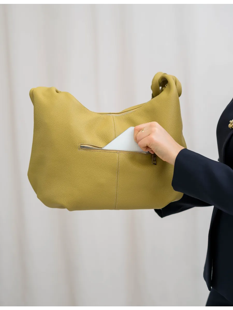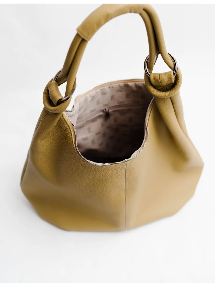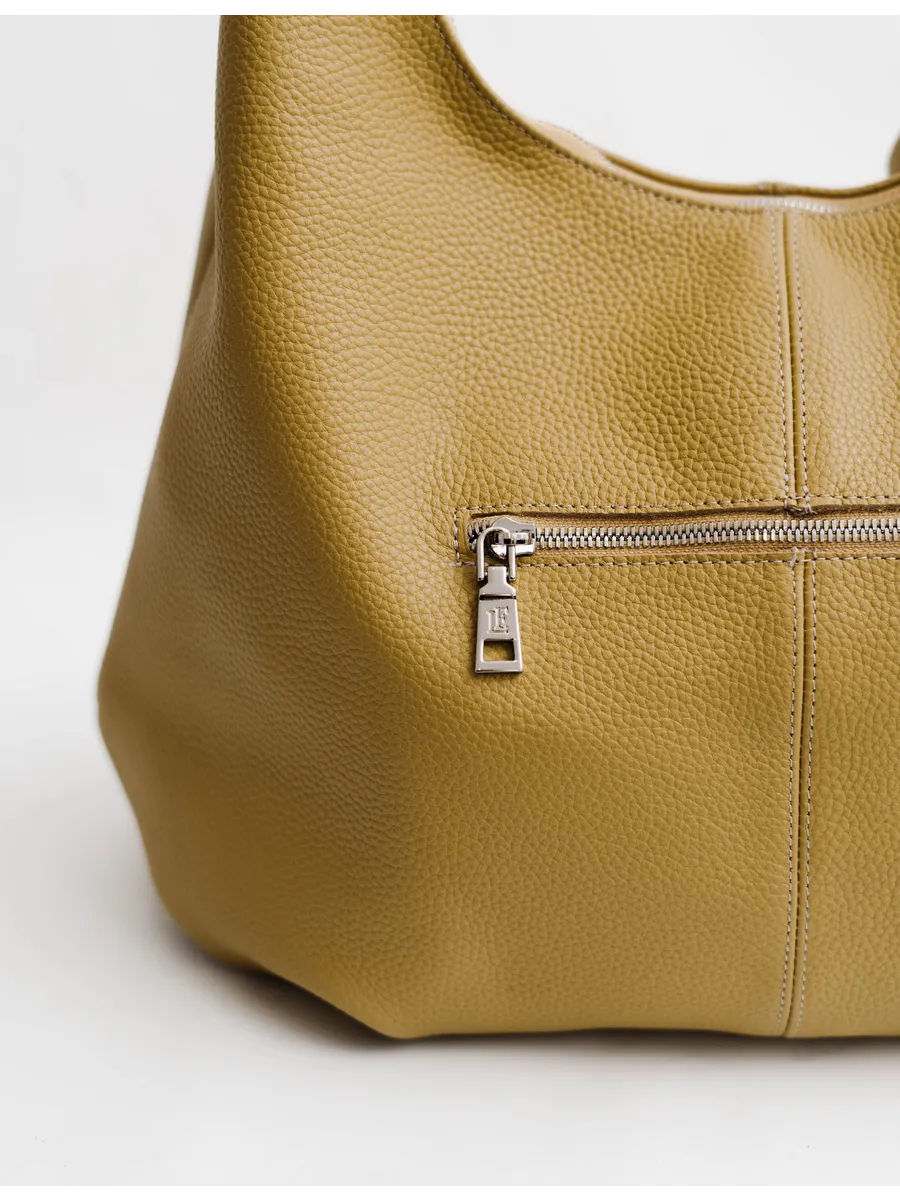 Внутреннее пространство продумано до мелочей. Сумка мягкой формы оснащена отделением на молнии, карманом для документов или мелочей. Надежная никелевая фурнитура гарантирует безопасность содержимого.