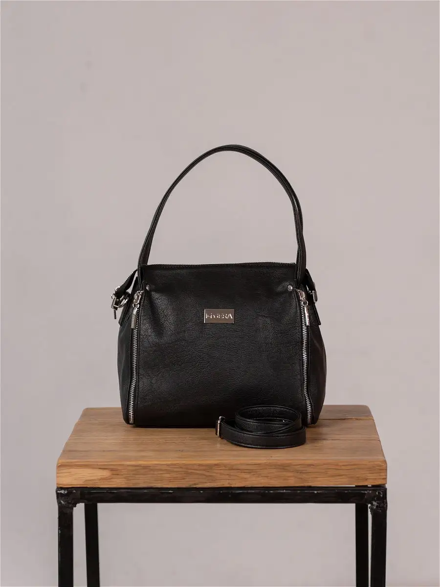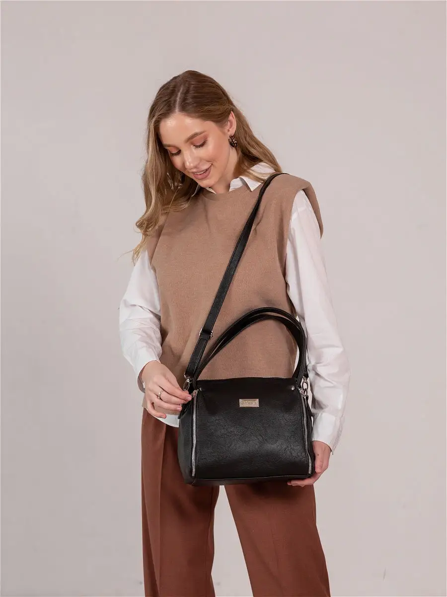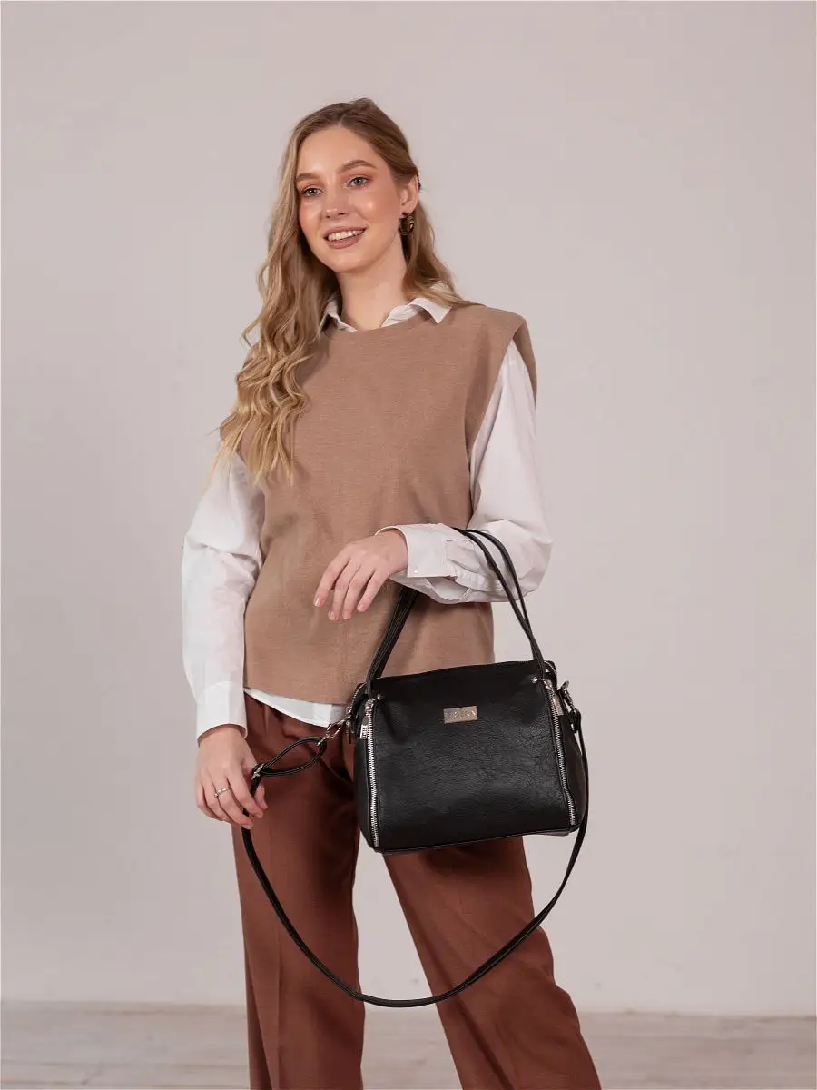 Универсальная, удобная и стильная сумочка. Произведена из материала - искусственная кожа, которая по своим свойствам не уступает натуральной. Сумка состоит из одного отделения, которое закрывается на металлическую молнию. Размеры 22*28*13 см, имеется внешний карман на задней стенки сумки и декоративные замочки по бокам. Лучше всего модель сочетается с луками в стиле кэжуал. Когда понадобится освободить руки, просто пристегните к аксессуару съемный плечевой ремень (длина 120 см), а также возможно носить изделие на руке или локтевом сгибе (высота 18 см).
