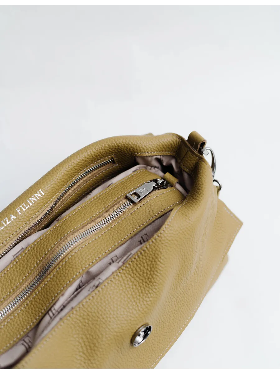Закрывается сумочка кросс боди на кнопки, что обеспечивает лёгкий и быстрый доступ. Внутри предусмотрено съёмное отделение на молнии, которое фиксируется внутри, но при необходимости легко вынимается. Такой вкладыш из подкладочной ткани можно использовать отдельно. Его размеры (22,5×13×6,5 см) позволяют компактно хранить вещи. Дополнительно внутри есть карман на молнии 20×12 см для документов и мелочей, а также потайное отделение для ценных предметов.