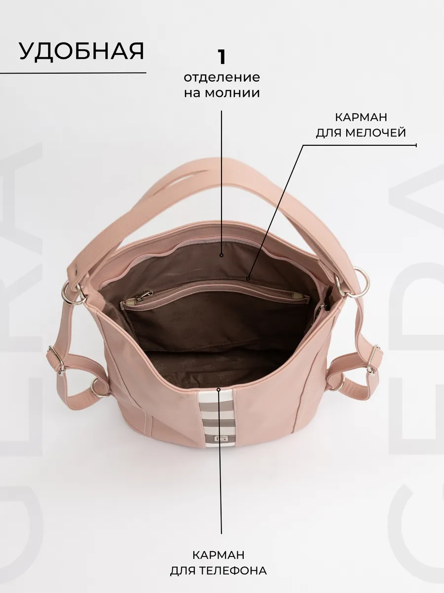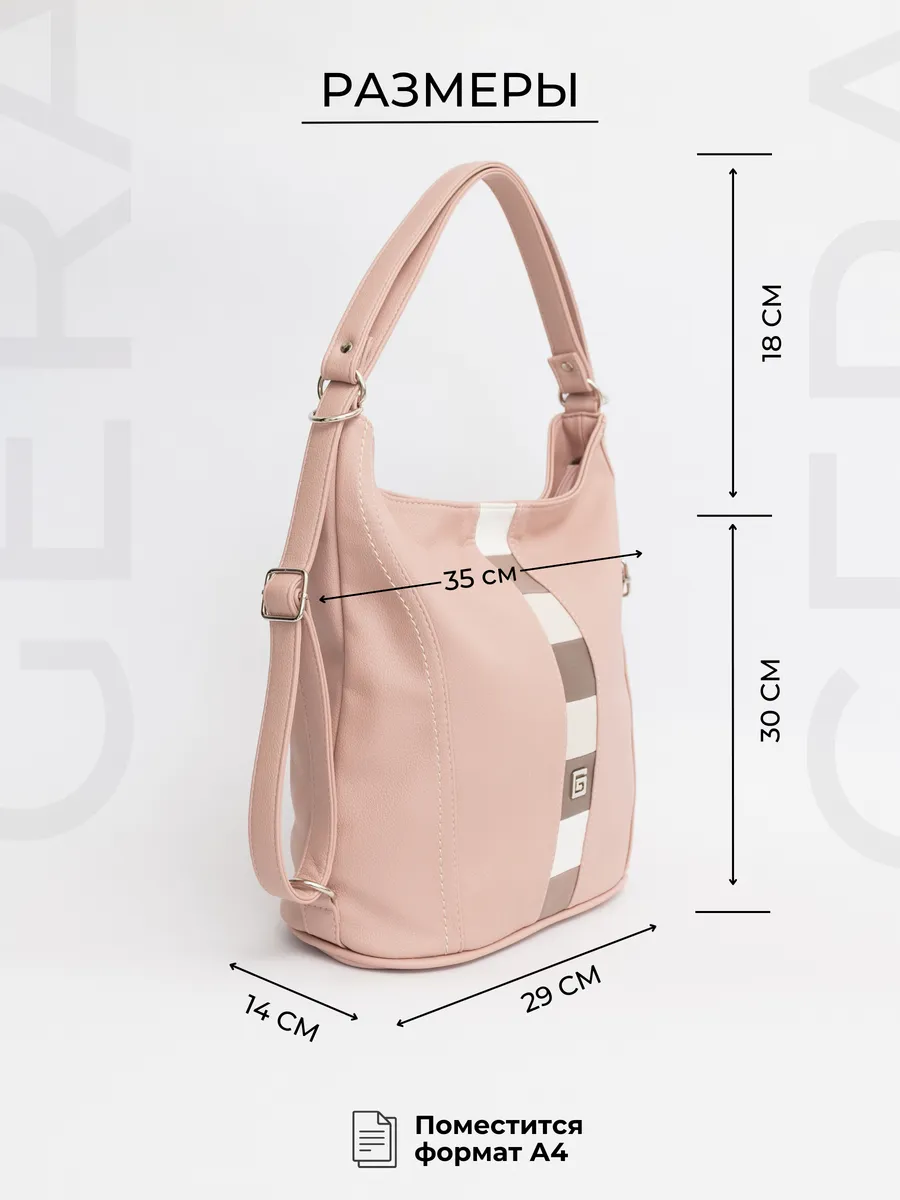 Представляем вам универсальную и стильную женскую сумку-рюкзак через плечо - среднюю классического дизайна. Эта стильная вещь станет незаменимым аксессуаром для девушек и женщин в любой ситуации - от повседневных дел до деловых встреч и путешествий. Цвет декоративной вертикальной вставки может отличаться от фото представленных на сайте. Сумка большая выполнена из искусственной кожи премиум качества, что обеспечивает не только эффектный внешний вид, но и высокую износостойкость и не уступает сумкам из натуральной кожи. Вместительный шоппер мешок, закрывающийся на молнию, позволяет удобно упаковать все необходимые вещи - от книг и тетрадей до тренировочной формы. Тоут средняя с двумя ручками для женщин и подсростков подойдет на каждый день, на прогулку, учебу в колледж школу университет, в офис или на работу. Яркий дизайн делает эту сумку идеальной для прогулок и учебы, а классический стиль будет уместен в офисе и на деловых встречах. Сумочка дамская через плечо также укомплектована отделениями для телефона и других мелочей, что позволяет легко и быстро найти нужный предмет. Шоппер кожаный достаточно вместительный. Эта универсальная вещь подходит как для подростков, так и для девушек, которые ценят стиль и комфорт. Модель имеет размеры ширина по верху 35см , ширина по дну 28 см, высота 30см глубина по дну 14см. Внутри одно отделение на молнии, на задней стенке карман на молнии, 3 кармана для мелочей, 2 на молнии, один карман открытого типа. Сумку трансформер можно носить в руках, повесить на плечо или носить как школьный рюкзак. Внутри хобо плотная подкладка, карман на молнии для мобильного телефона и карман открытого типа. Не упустите возможность приобрести эту многофункциональную и стильную не очень большую сумку через плечо от Gera! Прекрасный подарок на 14 февраля и 8 марта для любимой мамы или девушки! Женские сумки от бренда Gera - это качество российского производителя по доступной цене!
