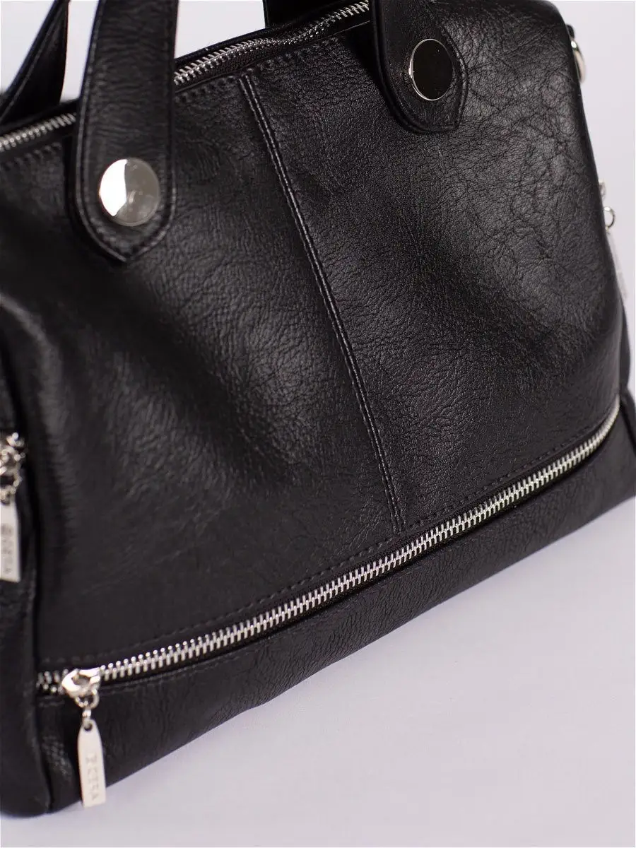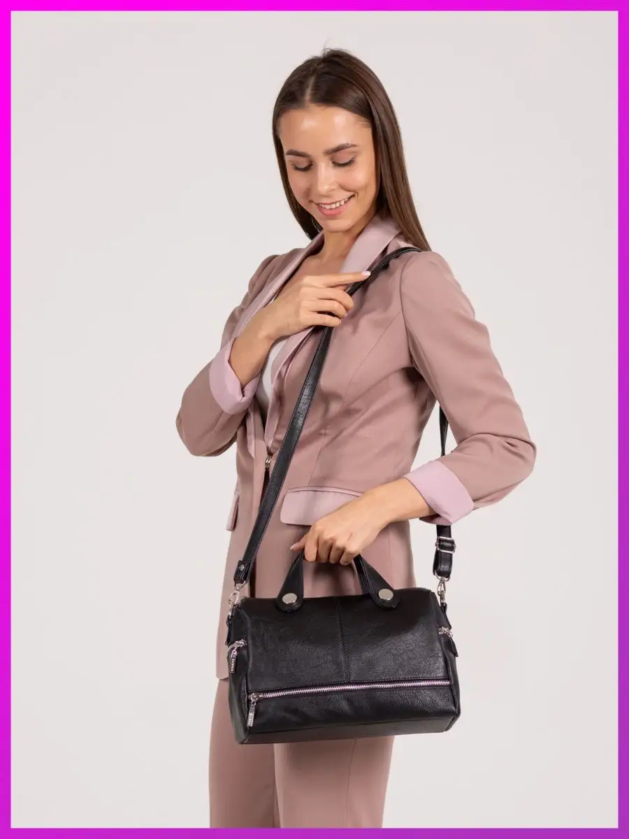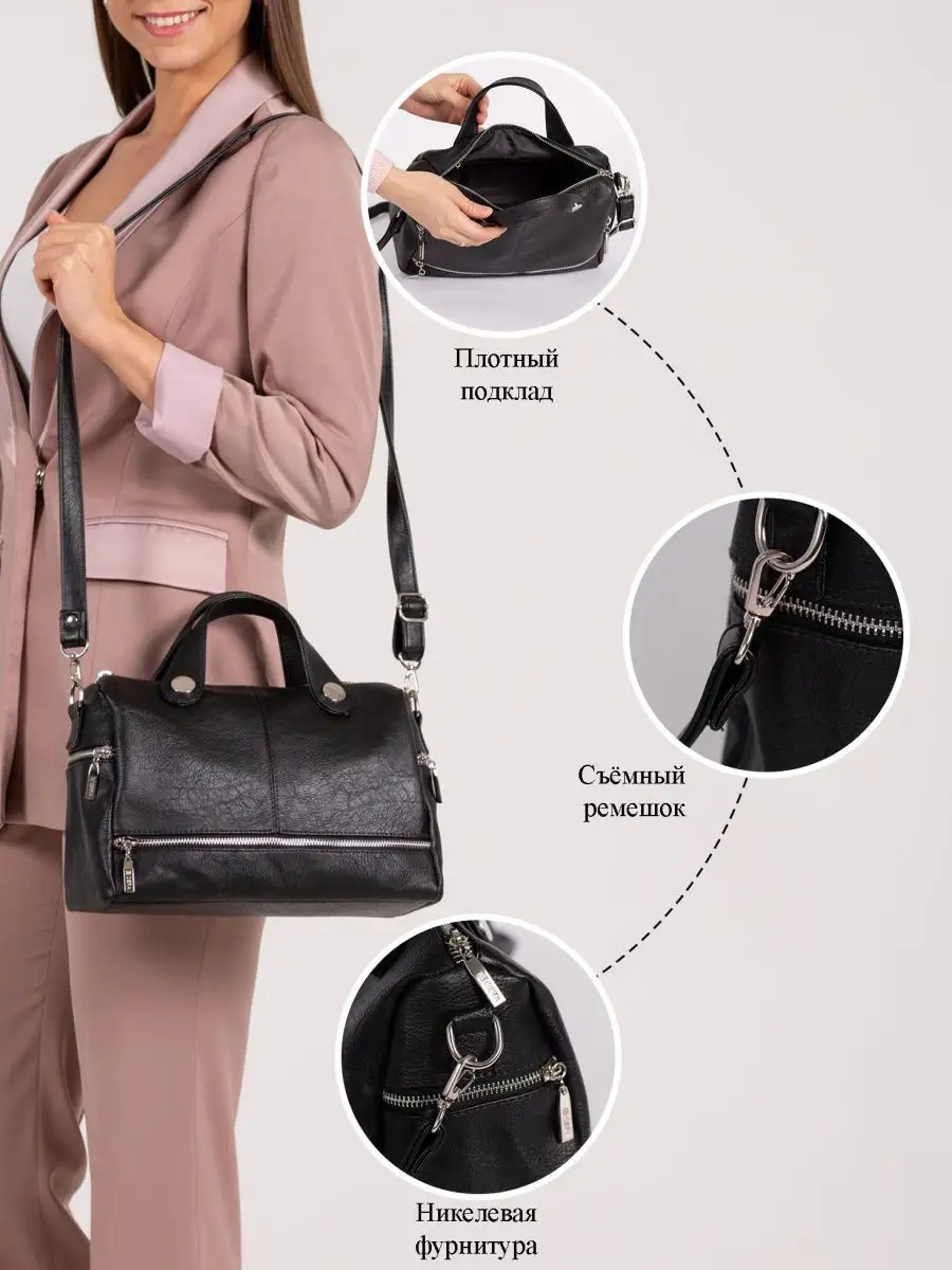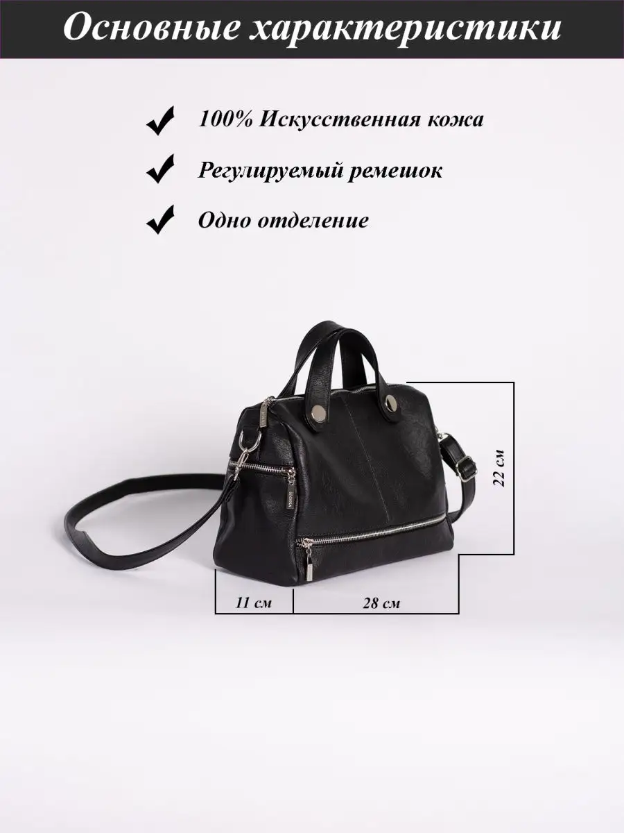 Сумка женская достаточно удобная и вместительная (размеры 22 11 28), внешний карман на задней стенке закрывается на молнию, в нем можно хранить мелкие вещи и важные аксессуары, имеются функциональные карманы по бокам. Внутри сумки два отделения на молнии, имеется карман на молнии для мобильного телефона и карманы открытого типа. Ручки, высотой 13 см, позволяют носить сумку в руках, так же для вашего удобства в комплекте есть плечевой ремень, который можно пристегнуть к сумке и отрегулировать. В целом, модель удобна и практична, поэтому идеальна для повседневного ношения. В то же время она совсем не скучная и для вечерних луков.