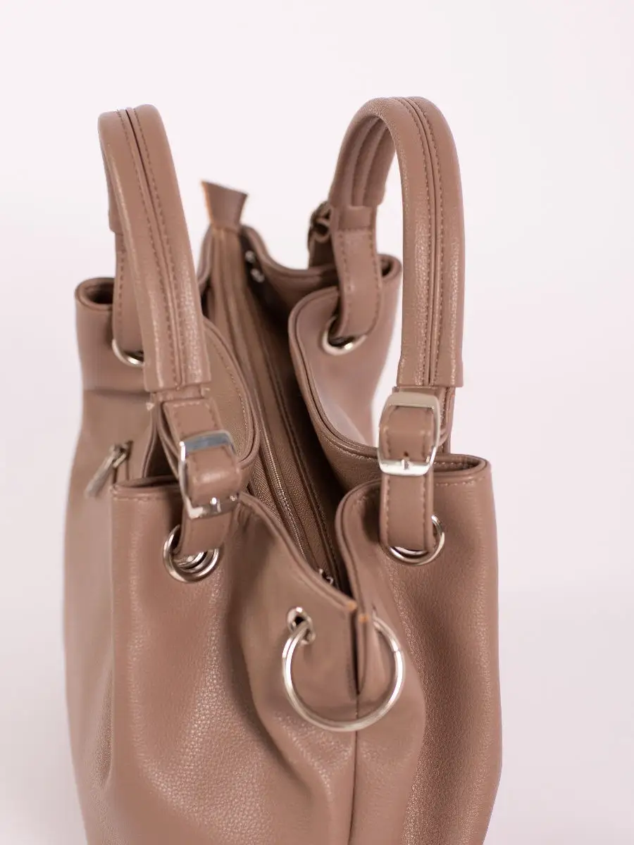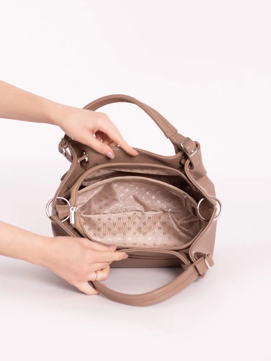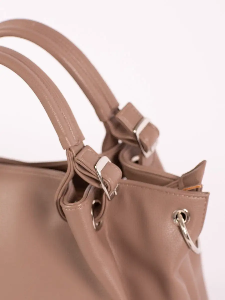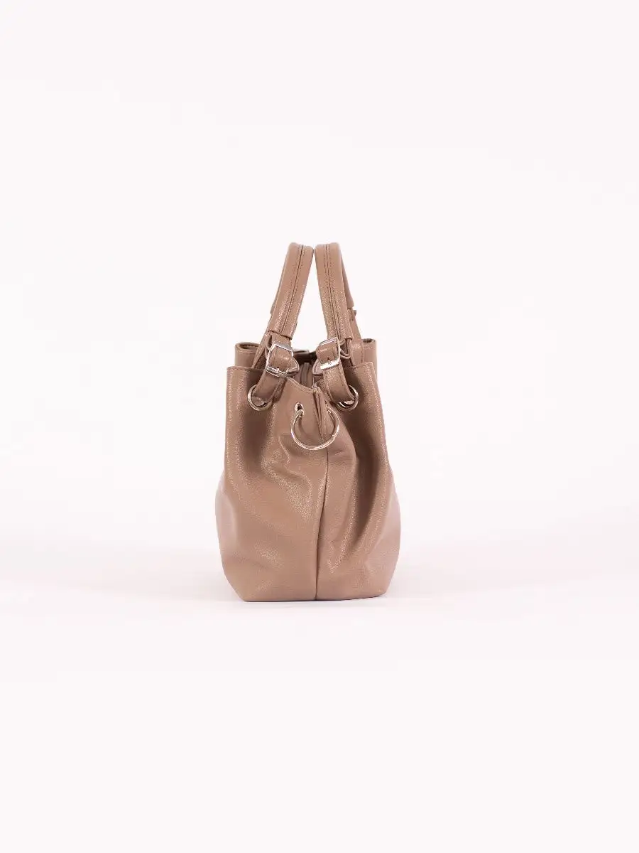 Мягкая сумка с карманом на задней стенке удобна и вместительна. Одно основное отделение и дополнительные карманы для различных, необходимых мелочей. Аксессуар идеально дополнит образ в городском стиле. Сумка будет уместна в офис или на учебу, на прогулке и на встрече с друзьями, выручит при незапланированном шоппинге. Мягкие складки и фурнитура по бокам выполняют декоративную роль. Дополнительный плечевой ремень идет в комплекте.